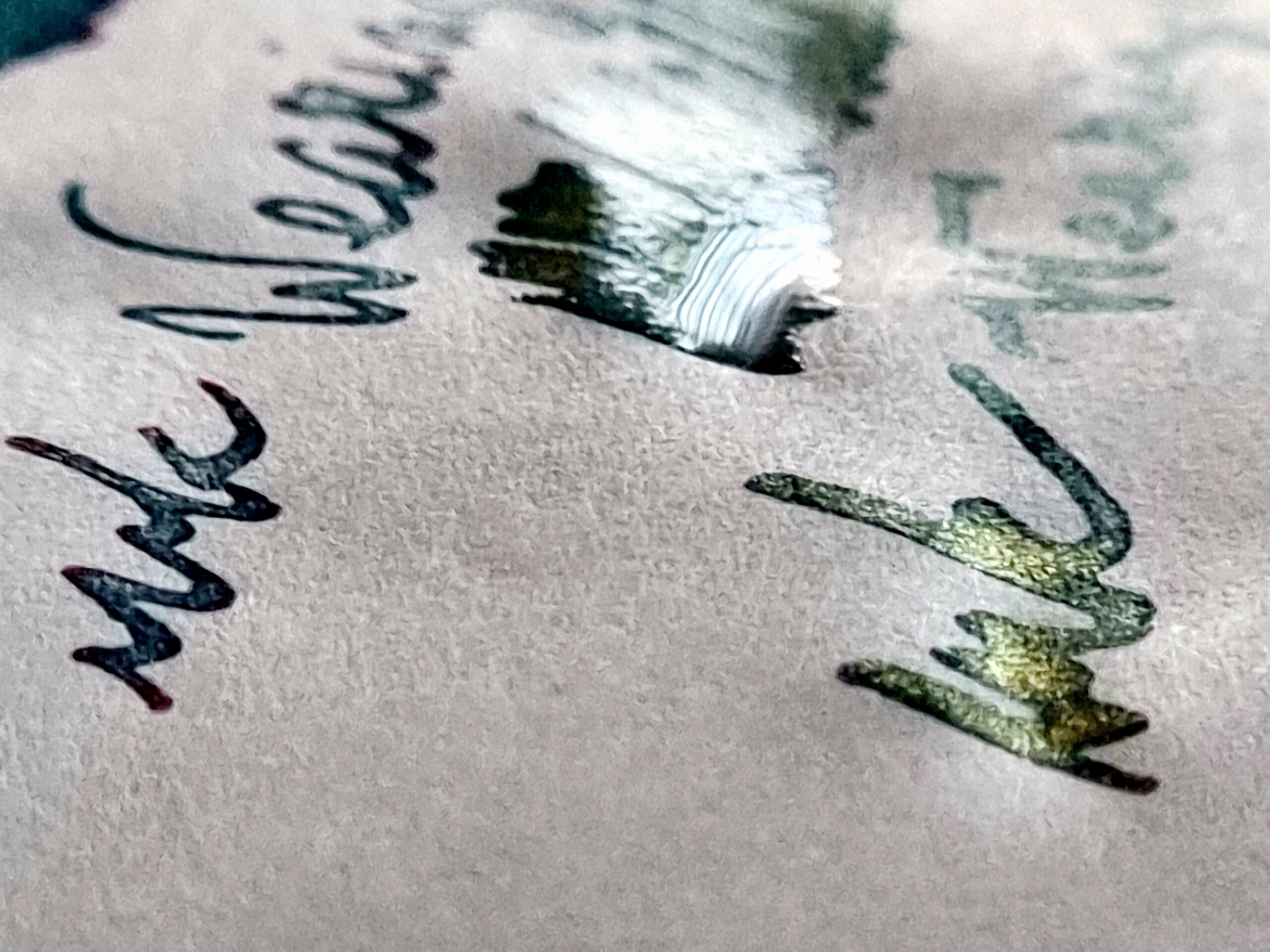 - Wearingeul’s Dewy Starlight, a teal ink composed from dual colors, light teal and dark green, with strong shading and (golden) shimmer.