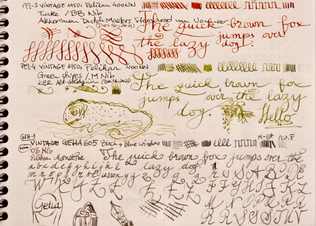 Figure 3 showcases the strokes made by Pelikan M and BB nibs, alongside the OB nib sported by the Geha 605. All of these nibs are made of 14k-gold. All of them write thinner than their modern equivalents; our hands and writing widths have increased significantly over the past six-seven decades.
