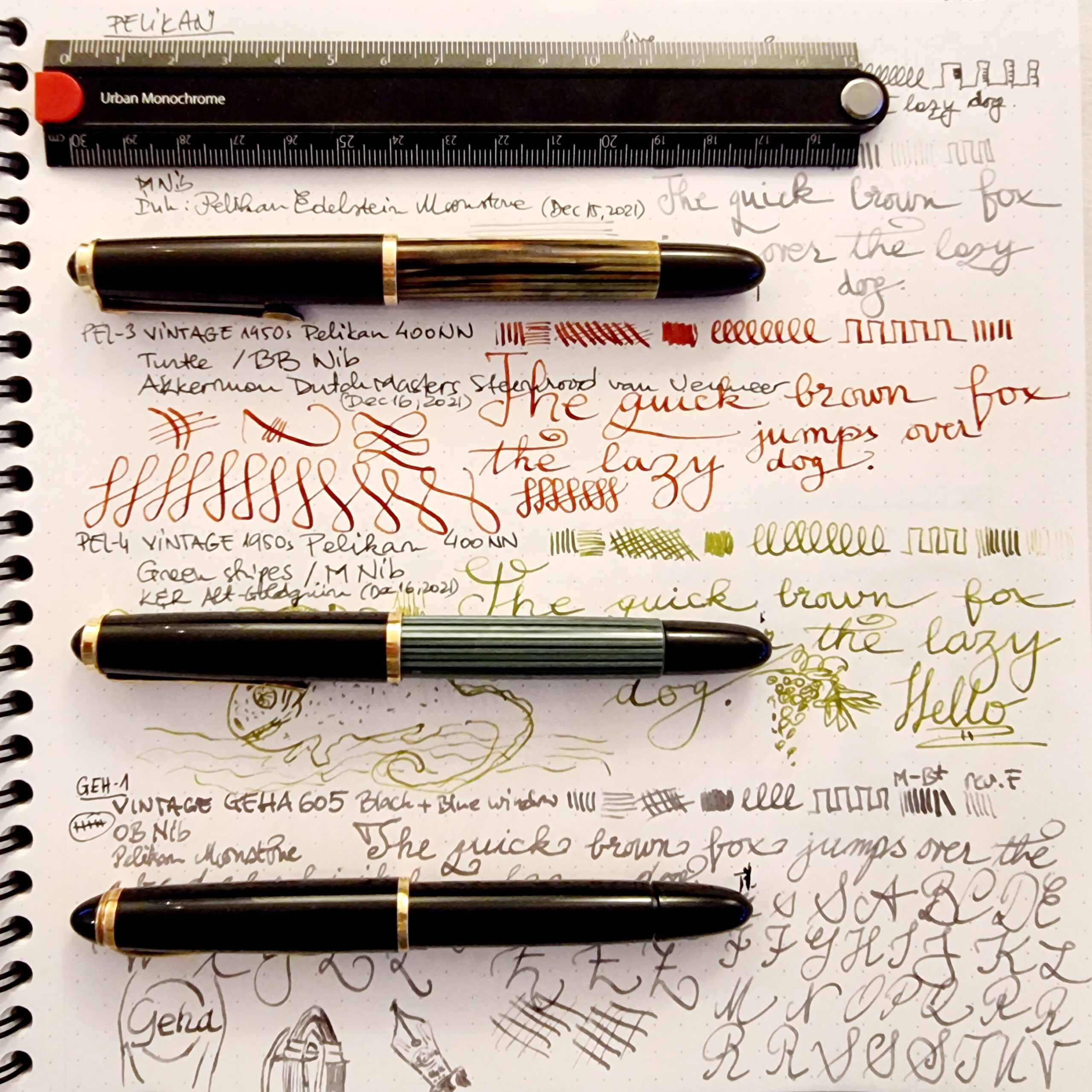 Figure 3 showcases the strokes made by Pelikan M and BB nibs, alongside the OB nib sported by the Geha 605. All of these nibs are made of 14k-gold. All of them write thinner than their modern equivalents; our hands and writing widths have increased significantly over the past six-seven decades.